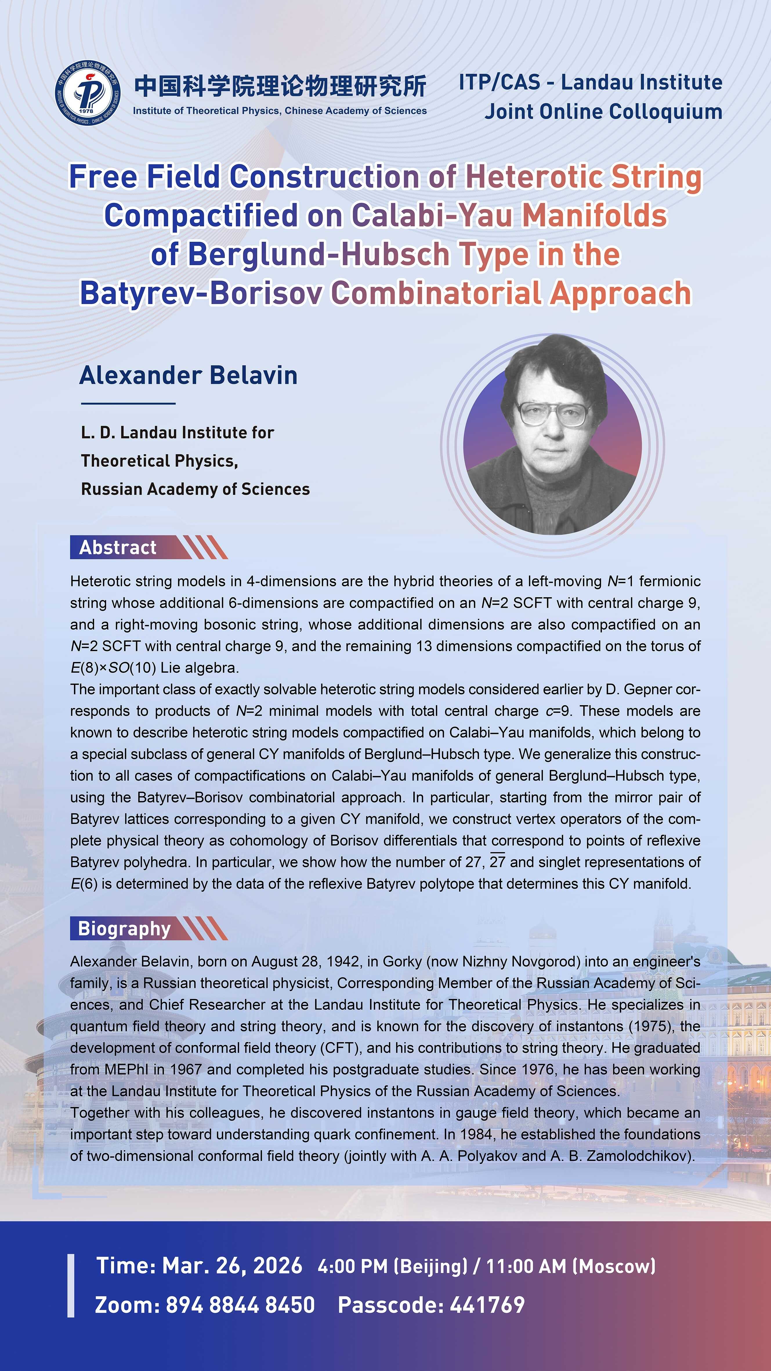 - Speaker Alexander Belavin (L. D. Landau Institute for Theoretical Physics, Russian Academy of Sciences)