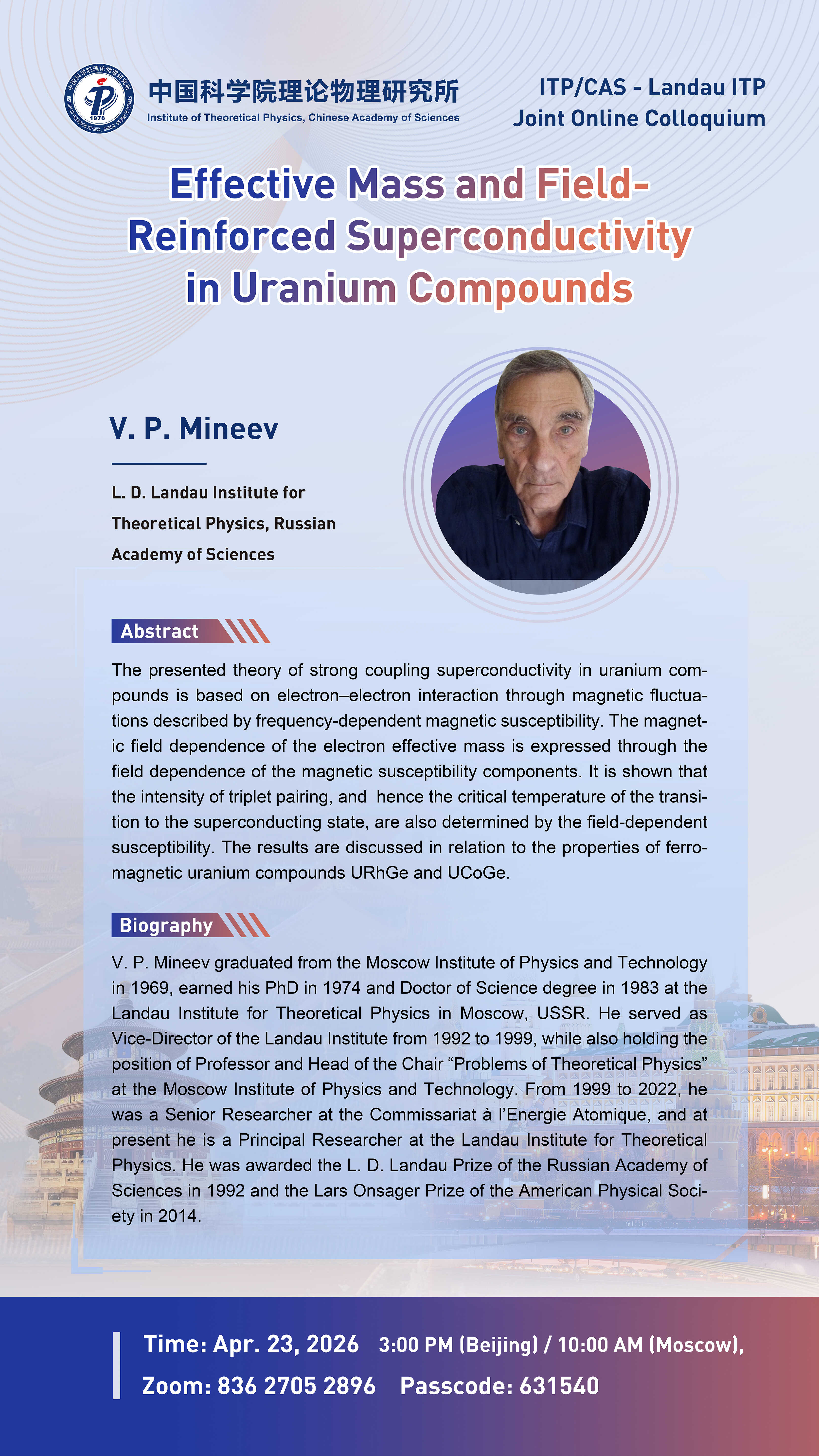 - Speaker V. P. Mineev (L. D. Landau Institute for Theoretical Physics, Russian Academy of Sciences)