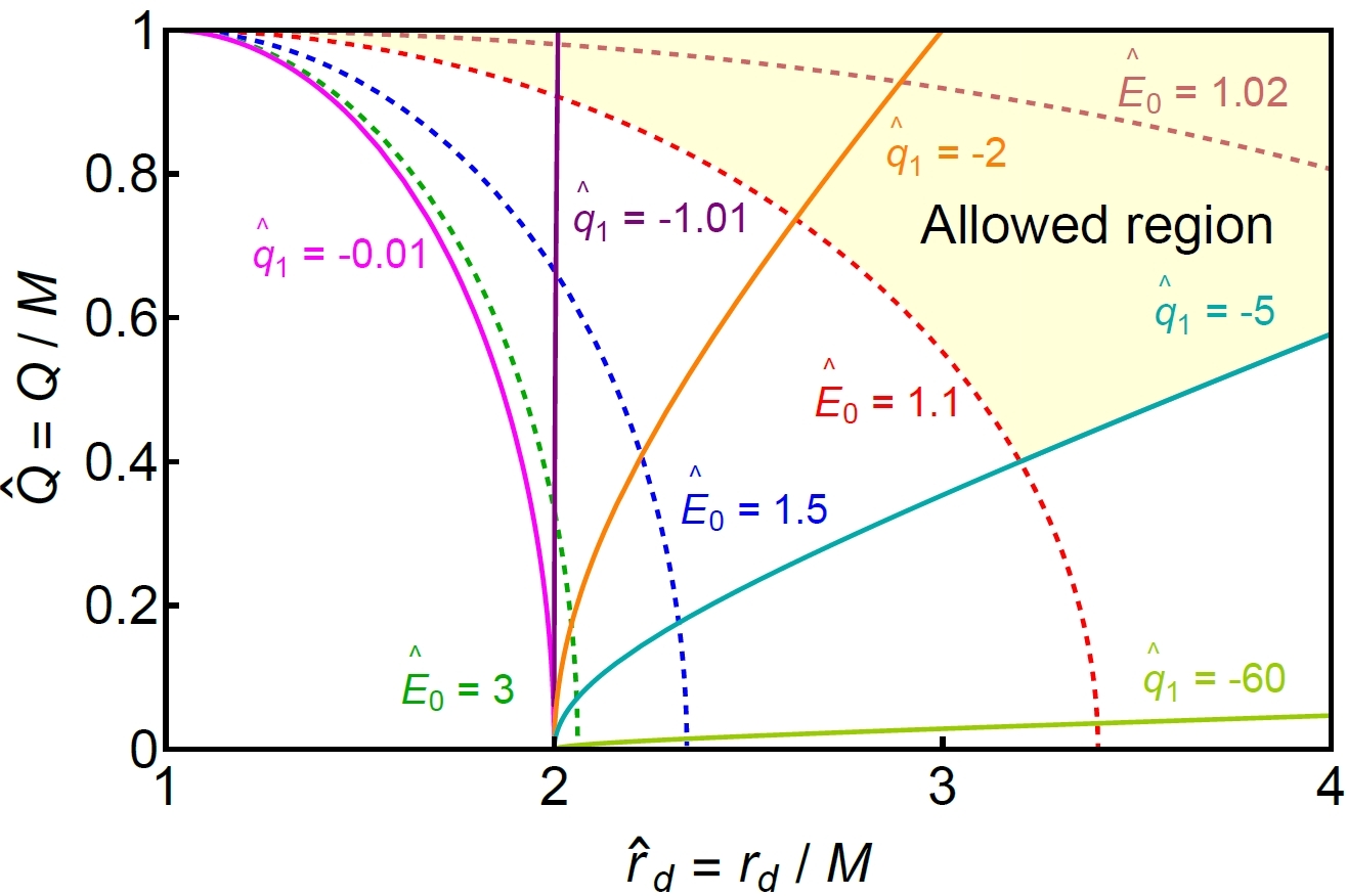[Figure: Allowed parameter space constrained by the two termination conditions for the electric Penrose process]